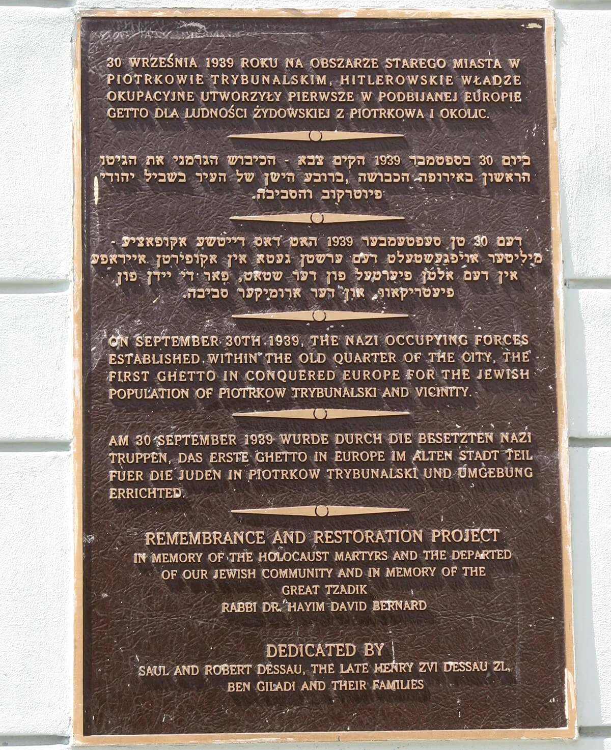 Memorial plaque on the site of the Piotrków Trybunalski Ghetto, the first ghetto ordered by the Germans in occupied Poland.