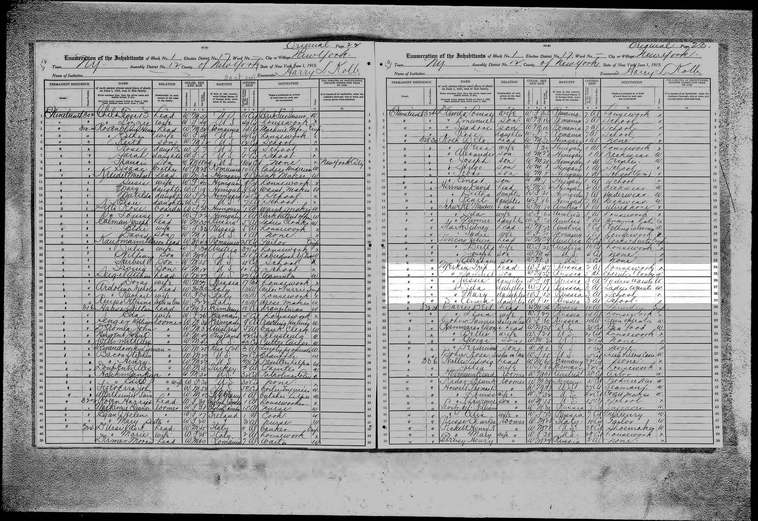 In the 1915 New York State census, all five of the Merkins who came to America — “Tzip” (Zipa), Samuel, “Gussie” (Katia), “Mary” (Miriam), and “Anna” (Anita) are listed living together at 328 19th Street in the Lower East Side of New York. Zipa is listed as the head of the family, 47 years old; Sam is listed as a 25 year old cloakmaker; Katia is 19 years old; Ida 17. Both are still working in “Ladies Waists”. Miriam, age 13, and Anita, 11 years old, are attending school.