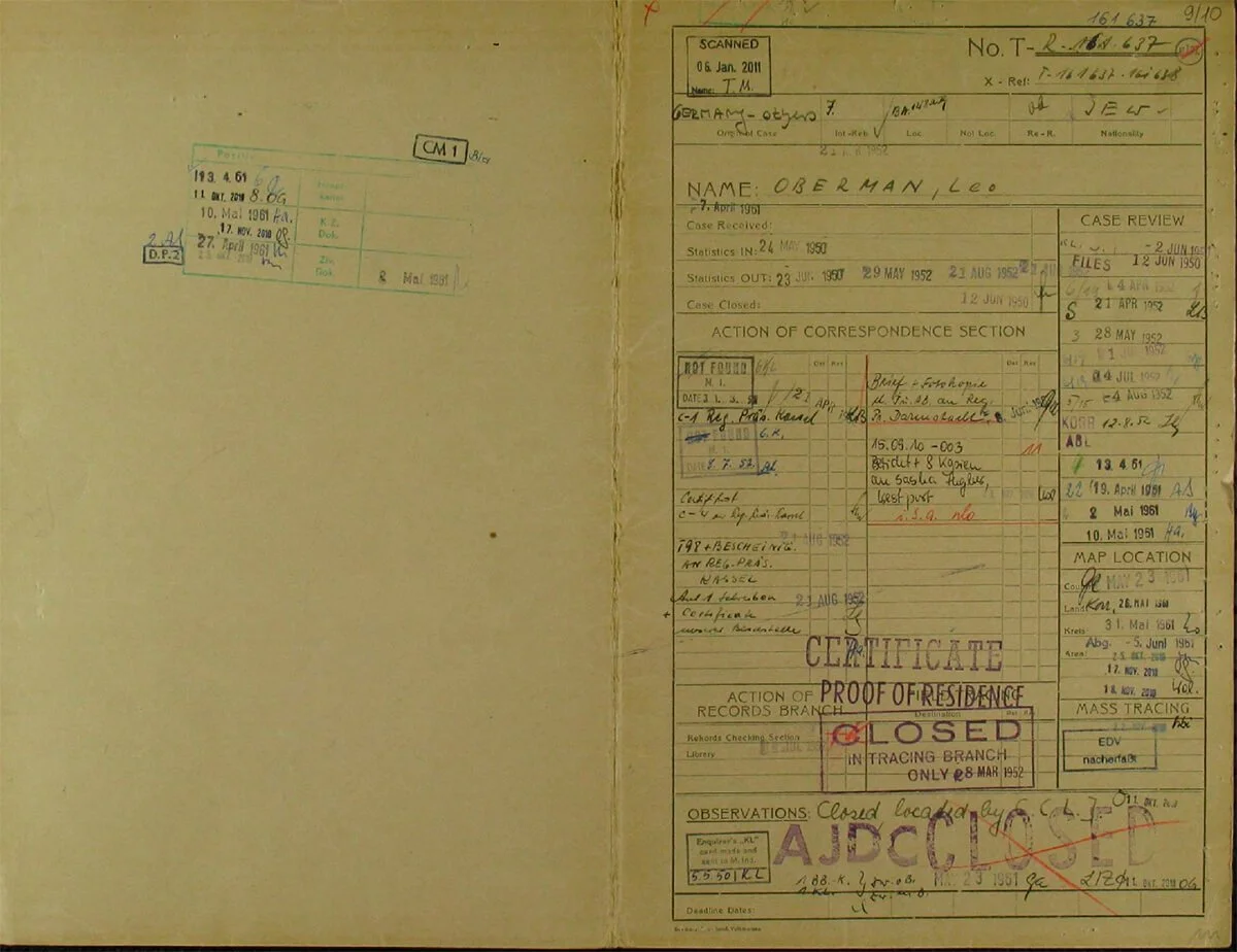 It is not surprising then, that the International Tracing Service required a full year to track down records we requested for Leo. When the ITS response arrived, the information was overwhelming. It included dozens of records of the time between the end of the war and the date Leo and Tosca Oberman traveled to the United States. And it continued on for several decades. And, because of the discrepancies, often involved exchanges between various government authorities, including police.