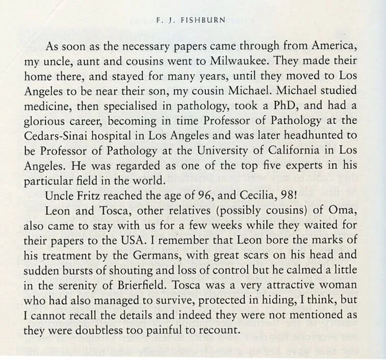 Jon told us that Jack Fischbein's son, Fred, was a young boy during Leo and Toska's stay and remembered that stay well: his family had persistently searched for several relatives who they hoped had survived the relatives and had housed them, leaving a permanent record of family generosity in his mind. Years later he wrote a book that covered that era of his family life.